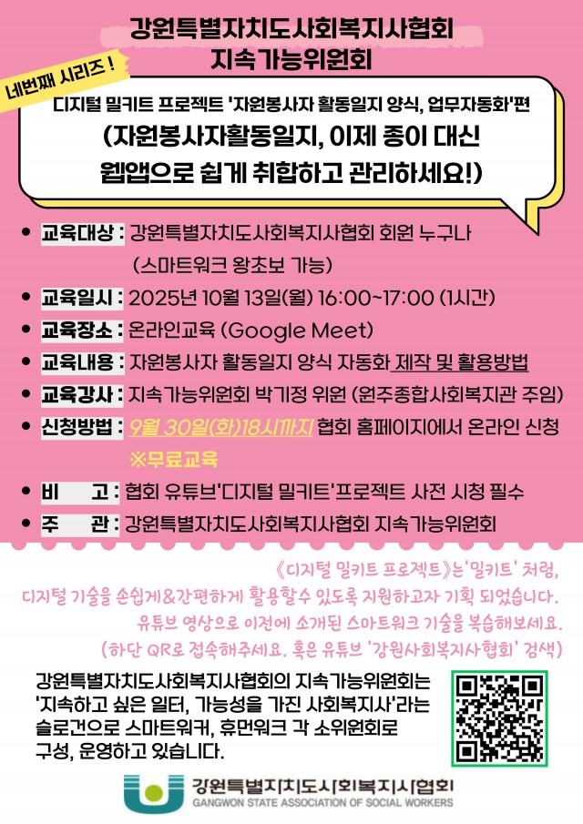 (강원사회복지사협회)지속가능위원회_디지털 밀키트 프로젝트_자원봉사자 활동일지_업무자동화 교육 신청 안내