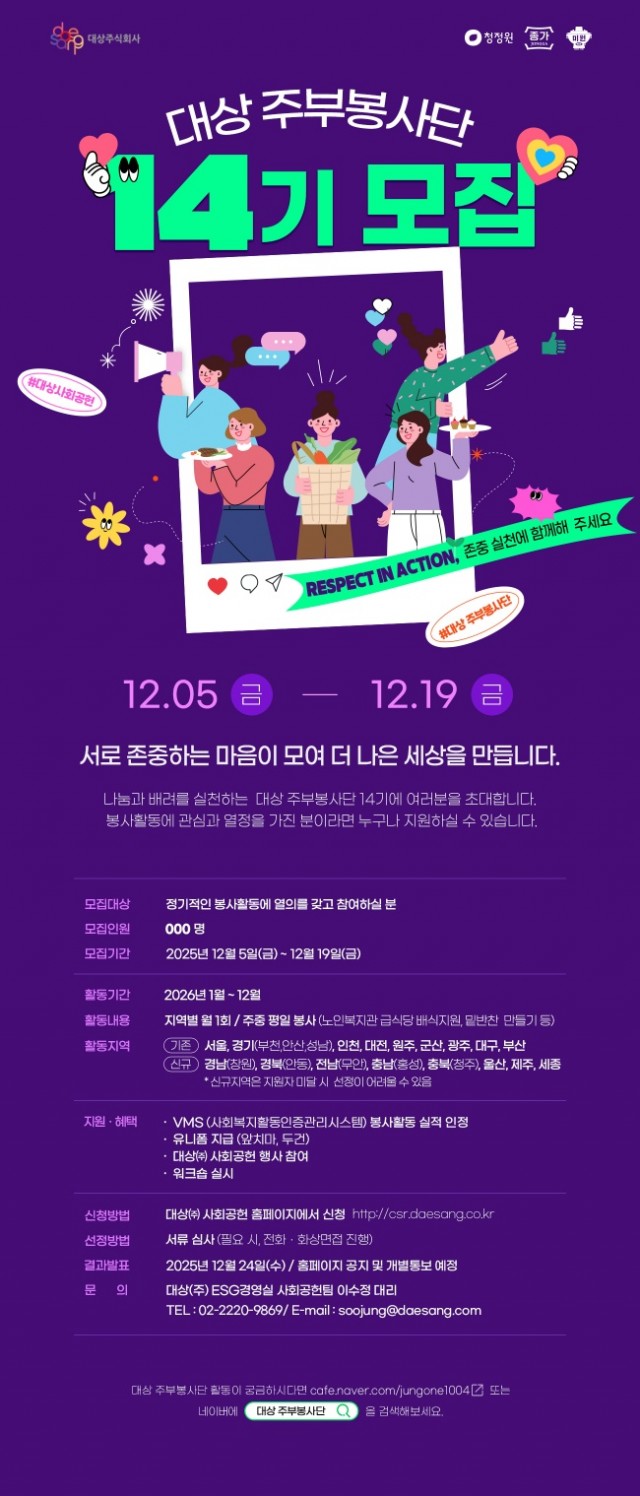 2026년도 1월부터 함께할 대상 주부봉사단 14기를 모집합니다.
